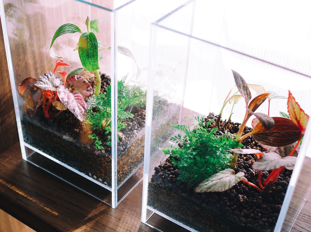 熱帯雨林に自生する植物なので、直射日光は避け、高音多湿な環境で育てます。私は密閉性の高いガラス容器で育てることにしました。ADA DOOAの Shizukuポットに、レインボーファン、フィットニア、コツボゴケ、タマゴケなどのテラリウム向け植物と一緒に寄せ植えしました。苔テラリウム用の土に植えていますが、マコデス・ペトラ単独なら水苔を使うのが一般的なようです。